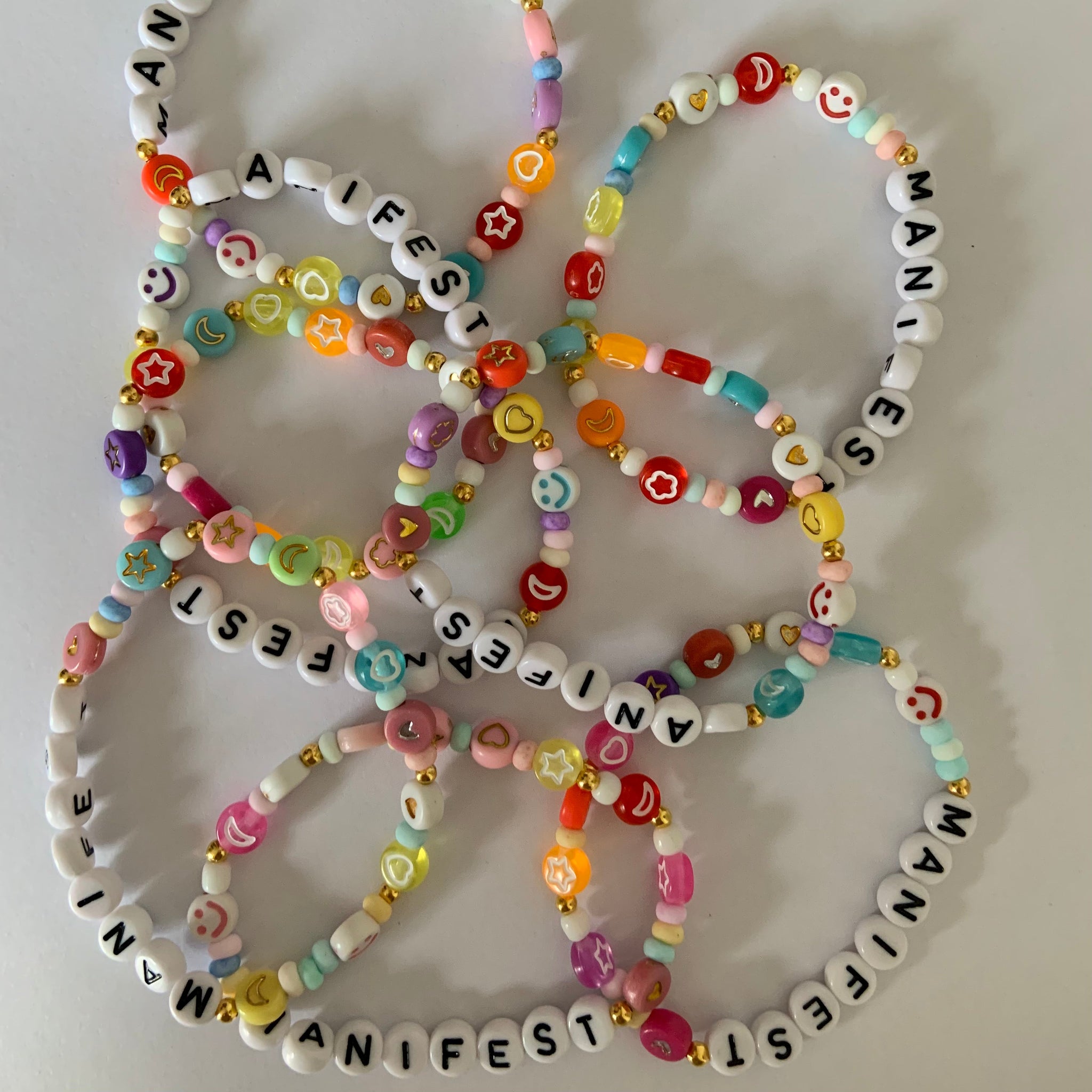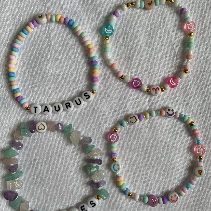 • All materials to make up to *4 bracelets. This will include: an array of different coloured/patterned beads, letter beads, charms, elastic, cord, - lots of options to create some magic!